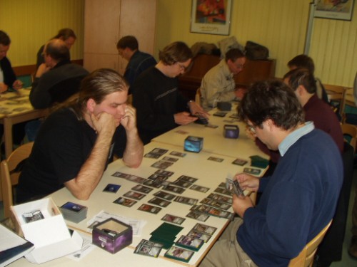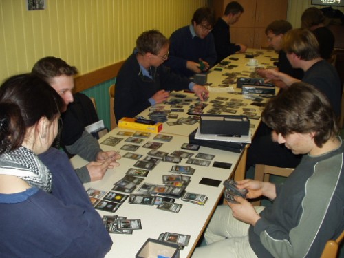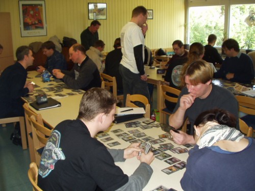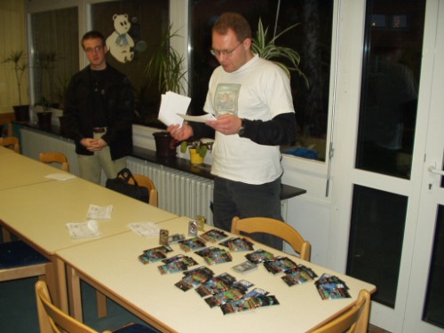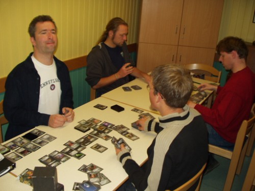 Fortuna blieb mir holt. Nachdem auch die AGT Packs gedraftet waren, wurden vor versammelter Menge die STCCG – Turnier Awards vergeben. Letztes Jahr hatte ich das Glück gleich zwei Awards abgeräumt zu haben, diesmal dachte ich, dass ich nicht soviel Glück haben würde, obgleich ich dreimal nominiert war. In der Kategorie „Best Strategy Article“ war neben mir auch Benjamin Ahlburg nominiert, mit seinen Gegenstrategien zu Cheesedecks. Und da ich bei „Before and After“ nicht wirklich alle kompatiblen Karten bewertet habe, habe ich fest mit einem Sieg von Benjamin gerechnet. Ich war sehr überrascht, als dann der Preis mir zugesprochen wurde. Mein Cardassianer Deck vom letzten Grand Prix war nominiert als „Best Deck 1E“, welches aber ganz klar von Sebastian Kirsteins Ferengi Deck „Ishka’s Rettung“ geschlagen wurde. Nochmal spannend wurde es als der „Best Player 1st Edition“ gewählt wurde, wo neben Mark Schütze, Alexander Bank auch ich nominiert war. Natürlich hoffte ich zu gewinnen, doch rechnete ich nicht wirklich damit, zumal ich bereits einen Award abgesahnt hatte. Natürlich war ich überglücklich als dann plötzlich mein Name genannt wurde. Nachdem ich mich artig vor der Mengen verbeugt hatte, nahm ich den Award entgegen. Alles in allem war es ein mehr als erfolgreicher Tag für die Bremer Fraktion: Ulf Benjes bekam den Lifetime Award als international bekanntester deutscher Spieler und Michael Bruns wurde ausgezeichnet für den besten Spielbericht und bekam den Pokal für den besten Intermediate Spieler.