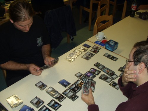 Mir gefiel besonders ihre Fähigkeit innerhalb kürzester Zeit durch Organ Theft die Anzahl des Personnels zu erhöhen, da man statt des durch den Shape-Shift Inhibitor verleideten Download überging lieber 2 Personnels von der Hand zu spielen. Und da der Haupteil der Vidiianer MEDICAL ist und über The Vidiian Sodality for free ausgespielt wurde war natürlich der Genetronic Replicator ein „Must“ für das Deck. Bei den Missionen war ich etwas dreist und hatte als Planeten die beiden High Point Delta Missionen Research Phage (40) und Restore Victims (55), wobei ich durch letztere noch einige Talaxianer for free ausspielen konnte. Zusätzlich war noch die Mirror Mission Disrupt Alliance, damit ich durch die downgeloadete Emblem Karte und die daraus folgende Art of Diplomacy schnell einen Vidiian Harvester ins Spiel bekomme für den Organ Theft. Bei den Space Missionen habe ich die beliebte Reinitialise Warp Reaction, sowie die beiden Nebula Missionen Inversion Mystery und Study Protonebula, mit der ich One downloaden kann, der durch Seven of Nine unterstützung erhält. Die beiden anderen Space Missionen kann ich per AMS auf 40 Punkte bringen und die Restor Victims auf 60, was 100 Punkte macht, allerdings anfällig für In The Zone, wodurch ich 10 Punkte noch zum Sieg benötige, die ich relativ leicht durch Organ Theft bekommen kann. Als Draw Engines waren lediglich Kivas Fajos – Collectors und Handshakes im Deck, sowie ein geseedetes Ancestal Visions mit diversen Chakotays im Deck. Bei den Dilemmas war ich auch dreist, da ich sowohl Scout Encounter verwendete, als auch die cardassianische Sleeper Trap. Dank des Battle Bridge Side Decks ist das Vidiian Scout Vessel stärker als die Olarra und mit der Sleeper Trap kann man gegen Hologramme die Tommygun als Handweapon downloaden. Ansonsten sind die Battle-Dilemmas sehr gut dafür den Gegner zu stoppen ohne, dass er seinen Vic Fontaine einsetzen kann. Da ich über 50 % Personnels im Deck habe ist auch der Shape-Shift Inhibitor kein Problem. So gewappnet dachte ich gegen die meisten üblen Decks antreten zu können. Als ich dann endlich am Sonntag nach Celle fuhr, musste ich feststellen, dass weder Marc Schütze, Alexander Bank noch Boris Nguessi am Turnier teilnahmen und somit meine größten Befürchtungen umsonst waren. Da dafür aber Sören Richter, Markus Rass und Christian Shopmanns dabei waren, die ja auch Spieler-Veteranen sind, war ich trotzdem auf der Hut.