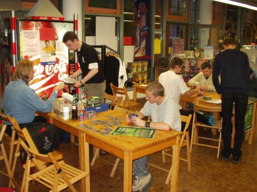 Mit leichter Verspätung ging es dann durch die Stuttgarter Weinberge auf die Autobahn Richtung Nürnberg, wo wir in der Höhe Ingoldstadt prompt in einen längeren Stau gerieten... Mit über einer Stunde Verspätung trafen wir gegen kurz nach 18 Uhr dann aber doch noch im Projekt Sieben Game Store ein, wo bereits der Erlanger Turnierleiter und vier weitere Spieler auf uns warteten. Mein Kollege Lars sprang schnell als sechster Teilnehmer ein und das Turnier konnte beginnen.
